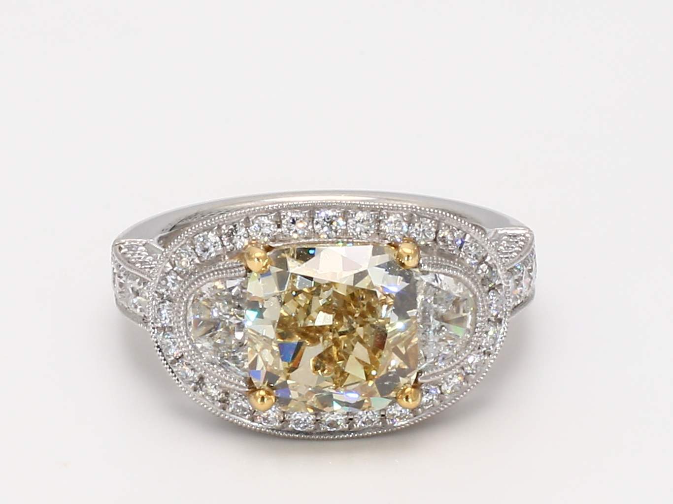 CUSHION FANCY BROWNISH YELLOW DIAMOND VS1 GIA 2105561649 & HALF-MOON & PAVE' DIAMOND PLATINUM RING