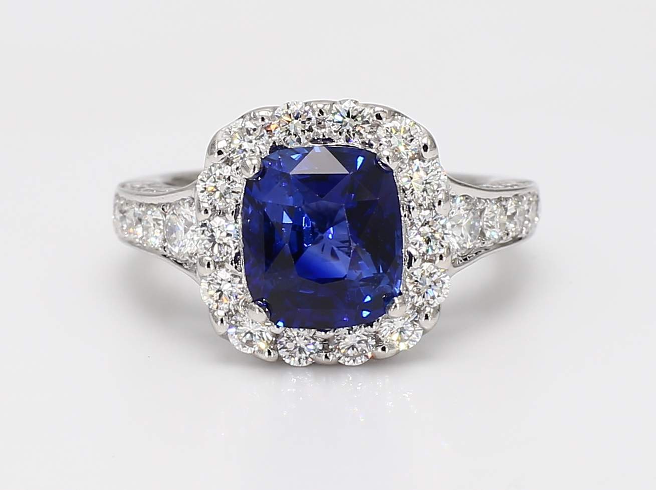 CUSHION CEYLON SAPPHIRE VIVID BLUE CDC 2505812 & PAVE' DIAMOND PLATINUM RING
