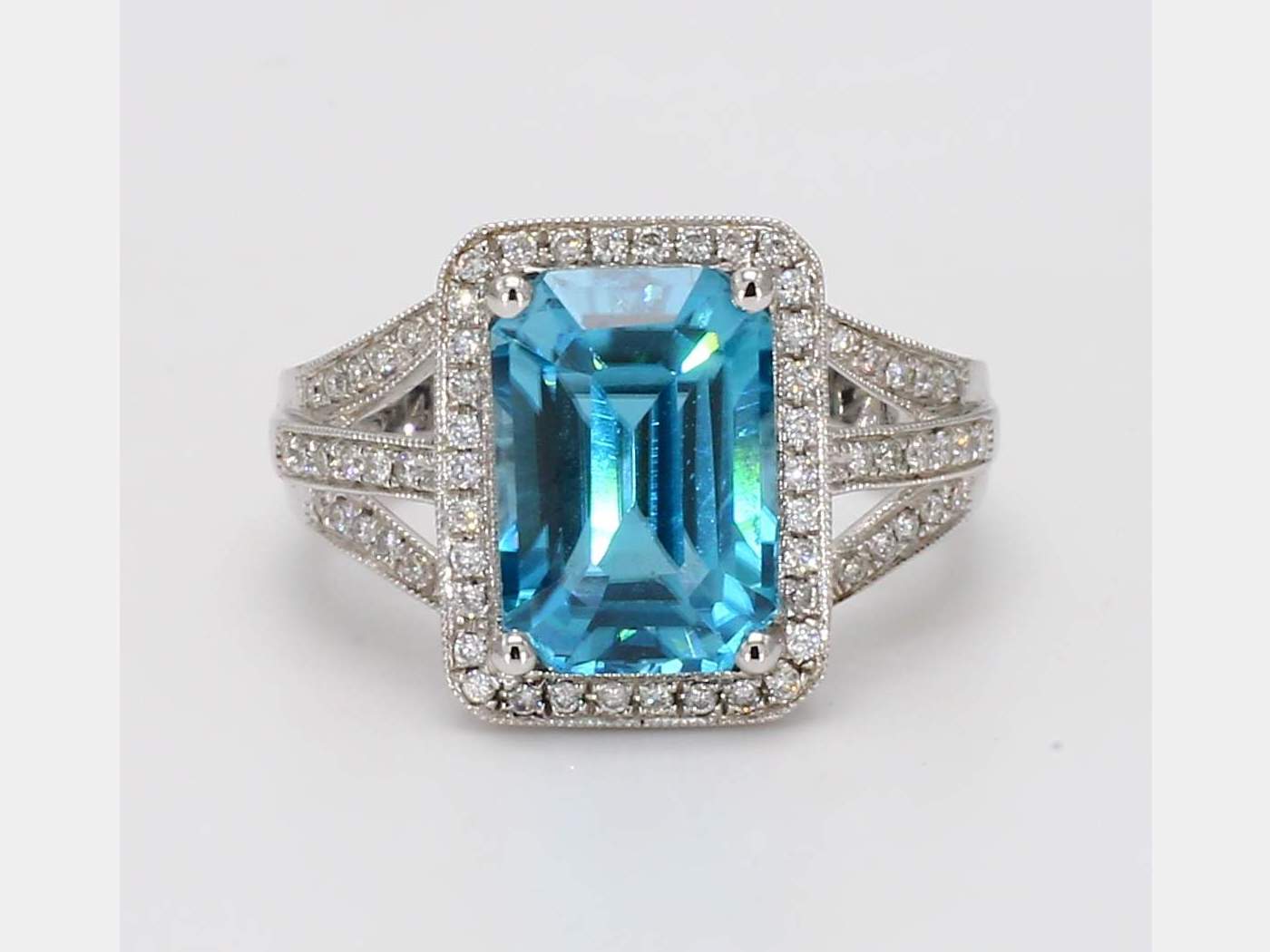 EMERALD CUT BLUE ZIRCON & PAVE' DIAMOND 14KW RING