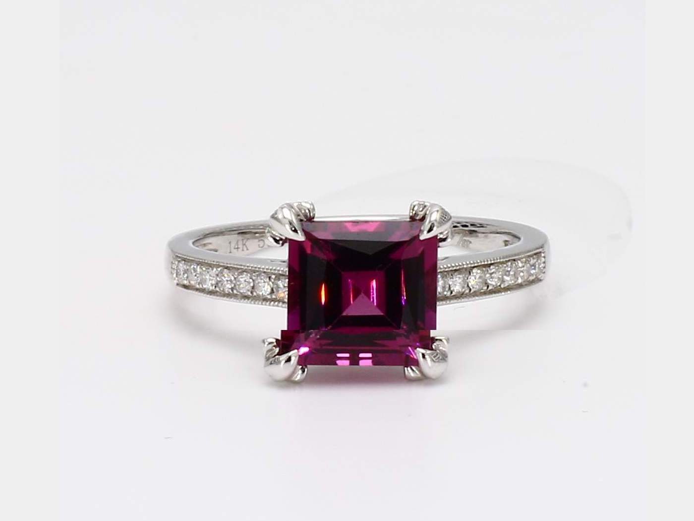 SQUARE RHODOLITE GARNET & ROUND DIAMOND 14KW RING