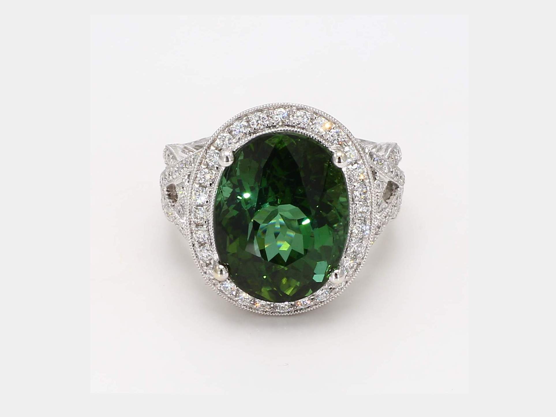 OVAL GREEN TOURMALINE & ROUND DIAMOND 14KW RING