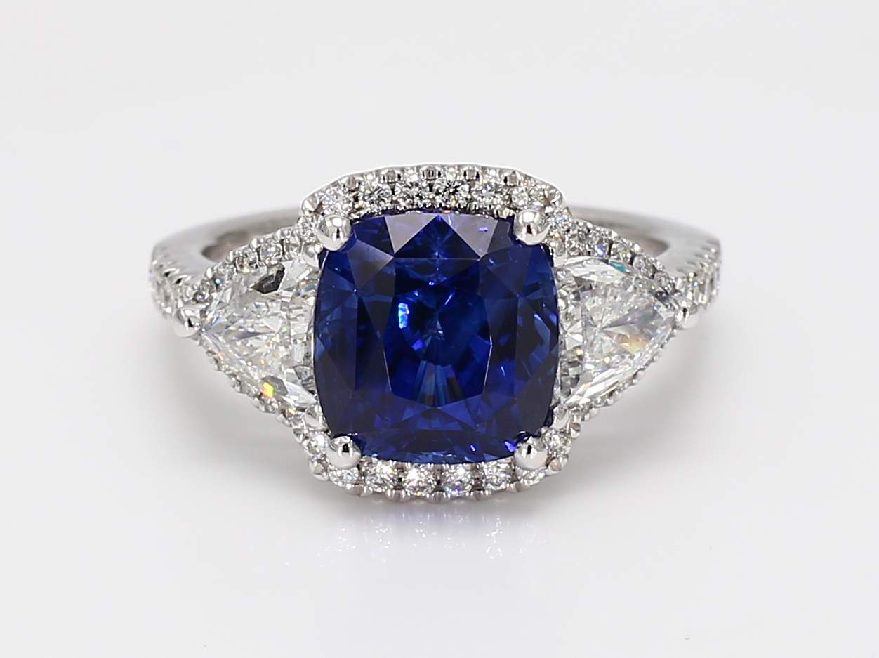 CUSHION CEYLON SAPPHIRE VIVID BLUE CDC 2506214 & SHIELD DIAMOND & ROUND DIAMOND PLATINUM RING