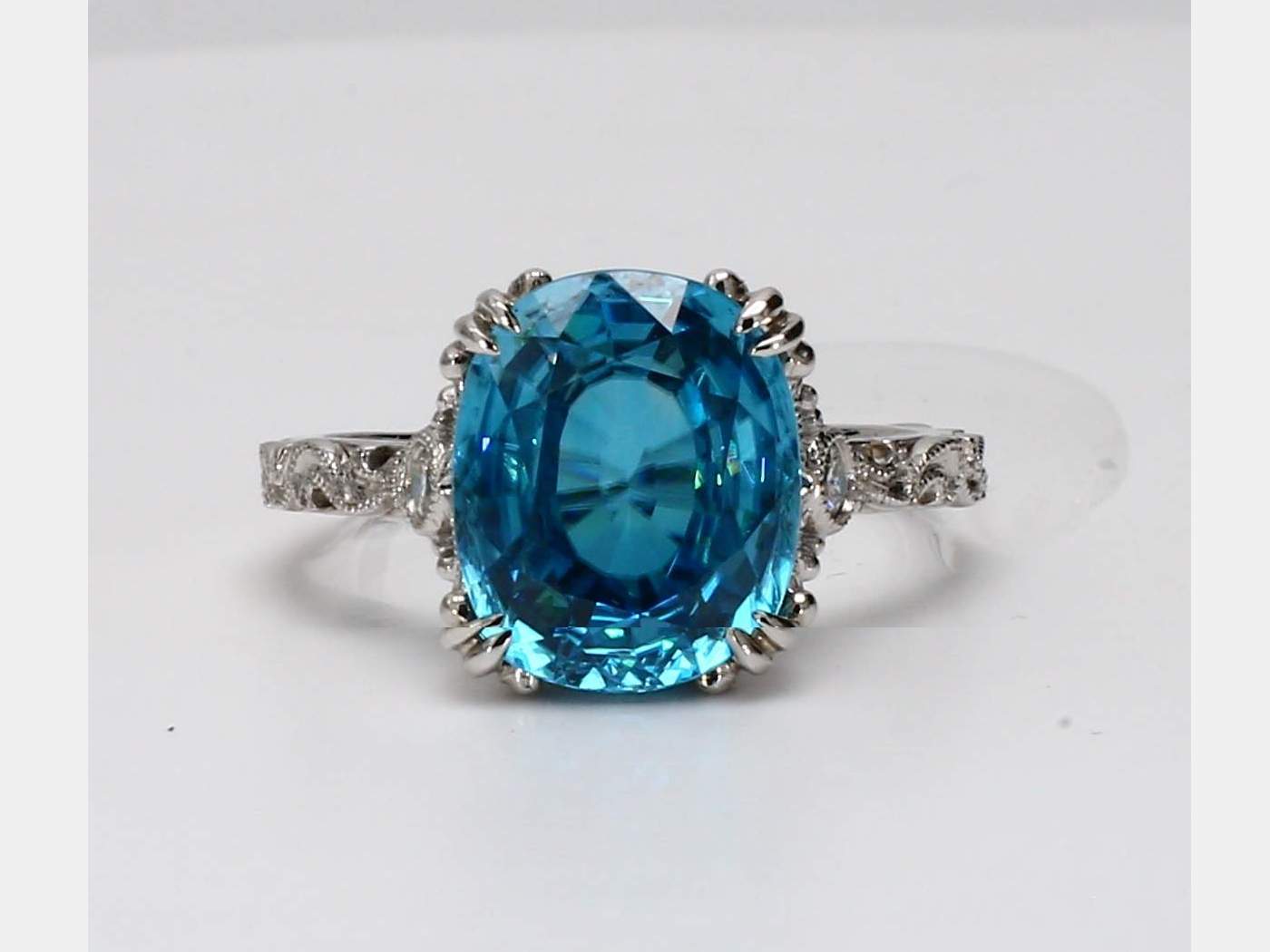 CUSHION BLUE ZIRCON & ROUND DIAMOND 14KW RING