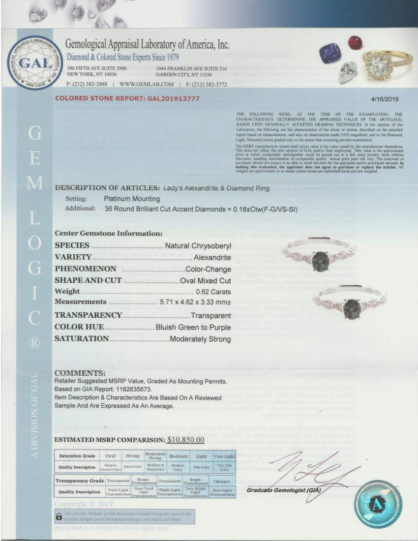 OVAL ALEXANDRITE GIA 1182635673 & ROUND DIAMOND PLATINUM RING