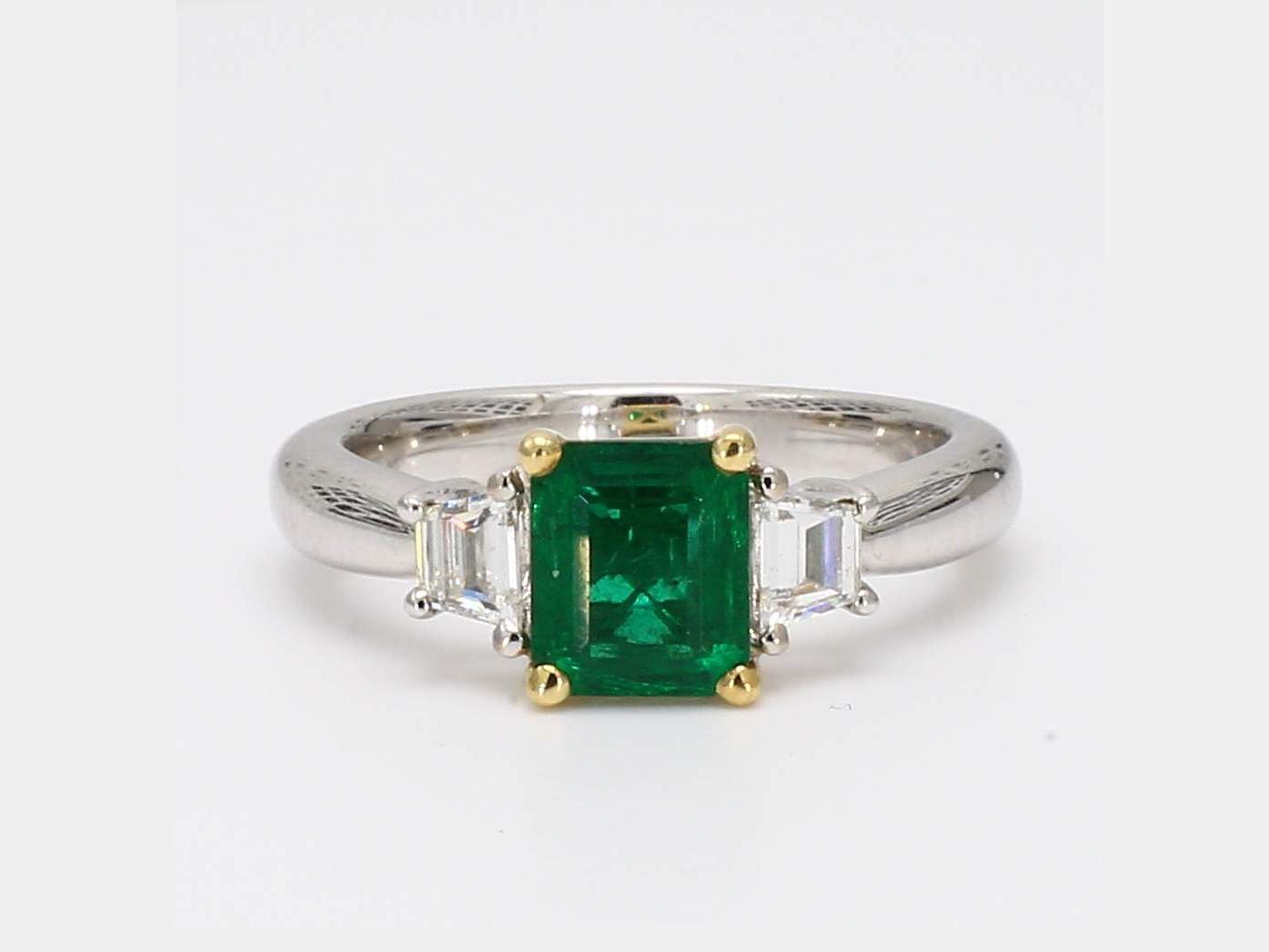 EMERALD CUT EMERALD & TRAPEZOID DIAMOND 14KW RING