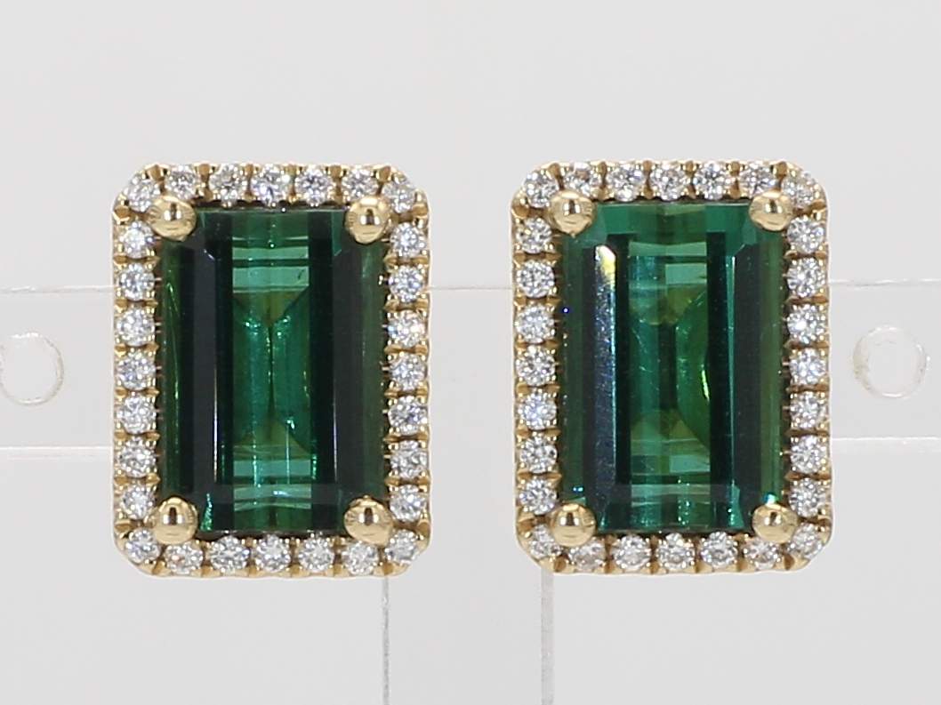 EMERALD CUT GREEN TOURMALINE & ROUND DIAMOND 14KY EARRING