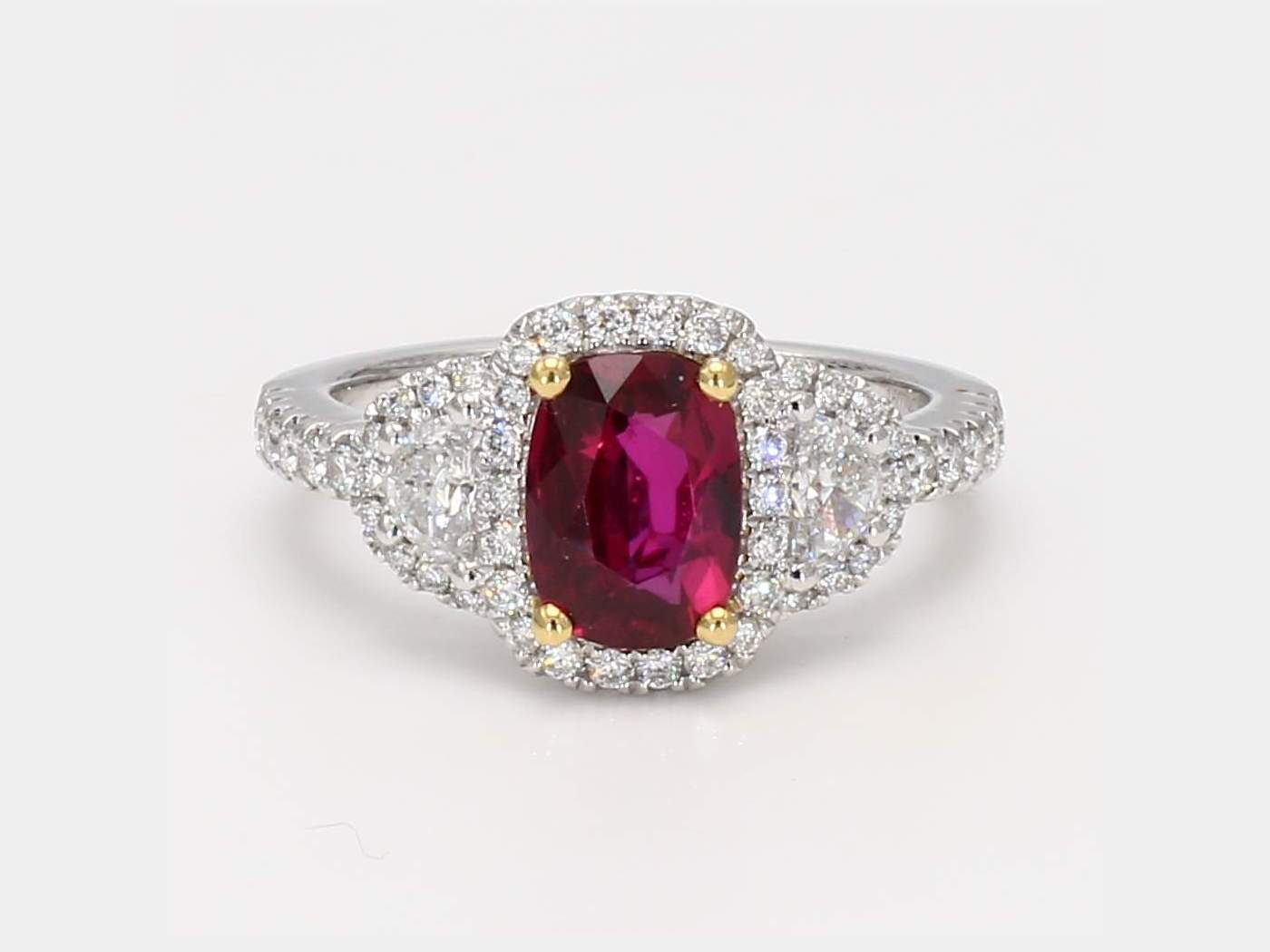 CUSHION RUBY & HALF MOON & ROUND DIAMOND 18KW RING
