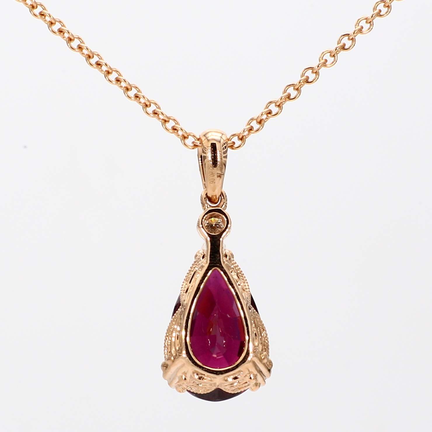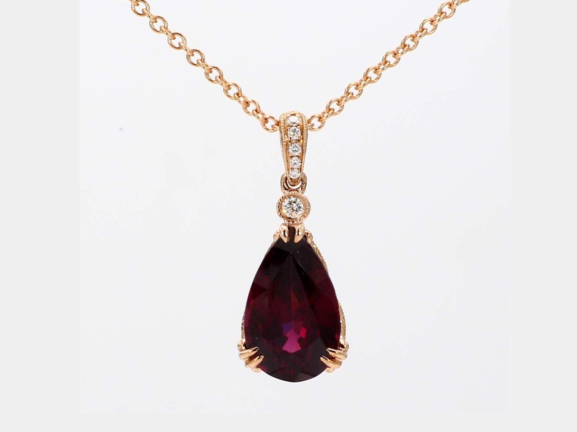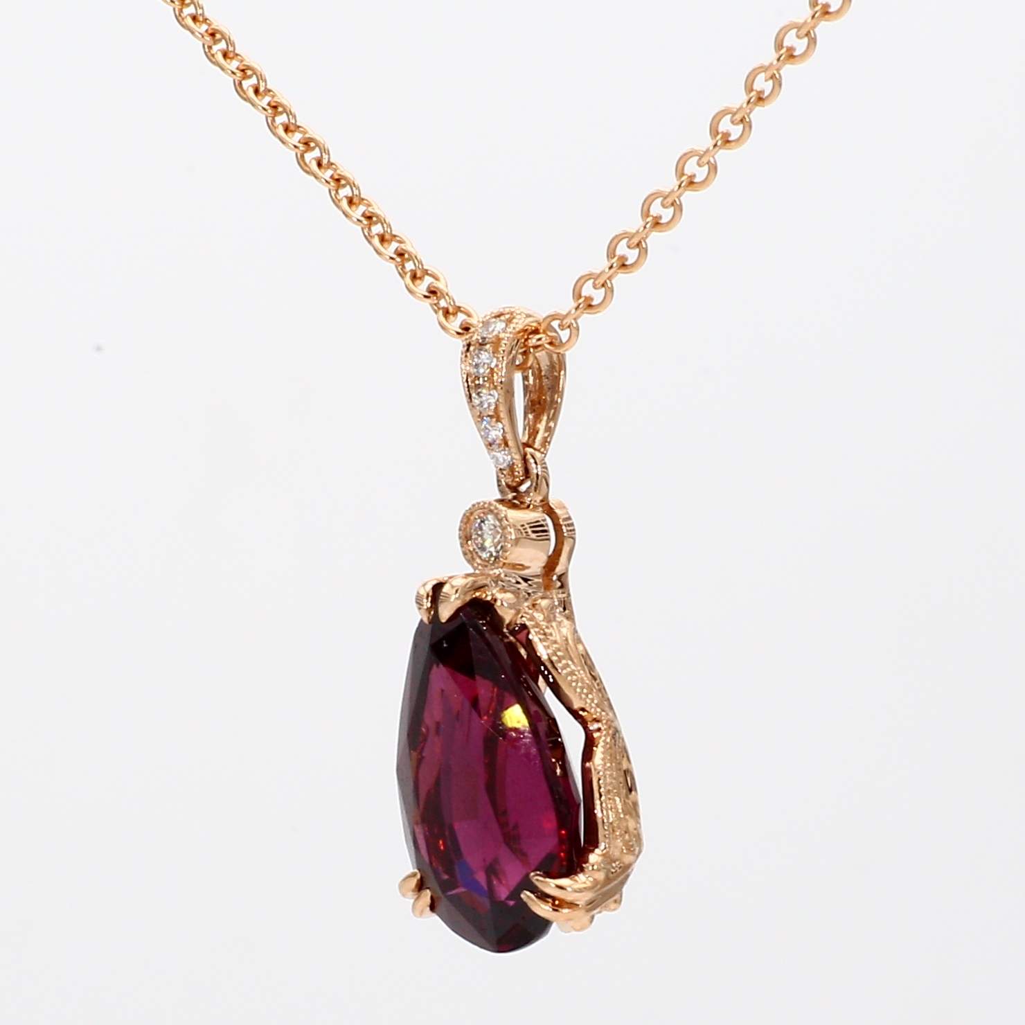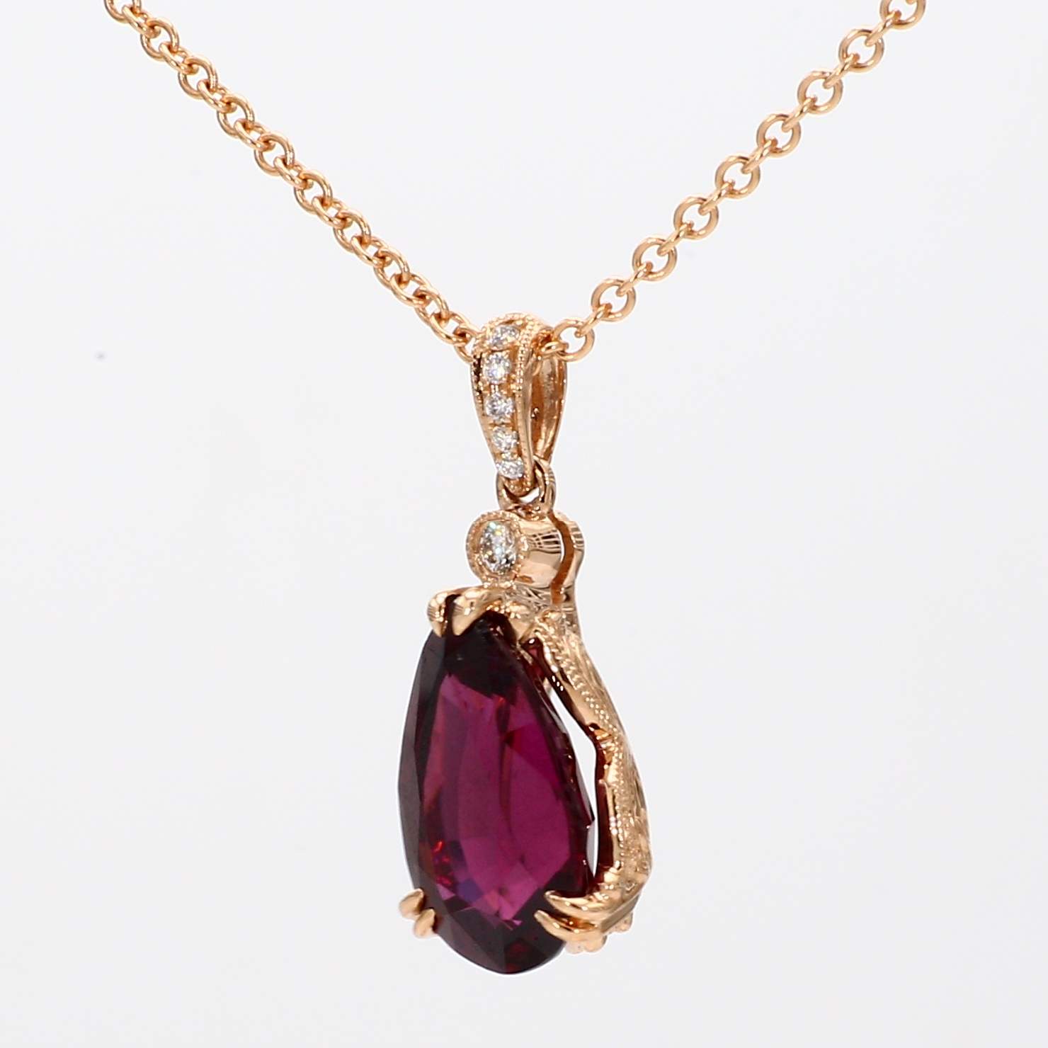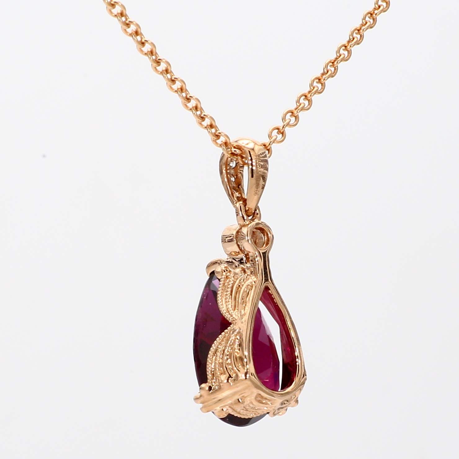 PEAR SHAPE RHODOLITE GARNET & ROUND DIAMOND 14KR PENDANT