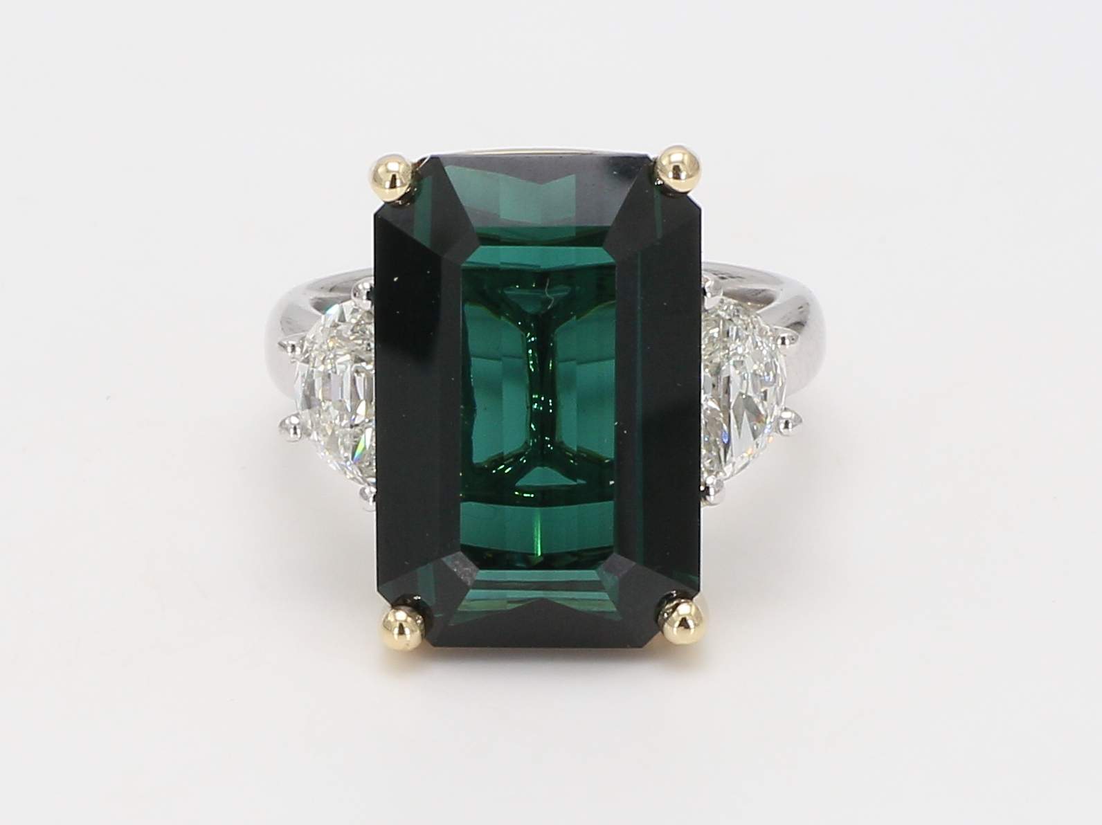 EMERALD CUT GREEN TOURMALINE & HALF MOON DIAMOND 14KW RING
