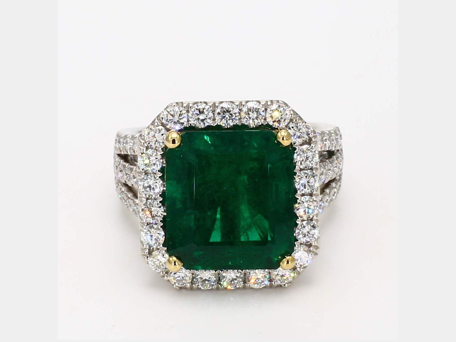 EMERALD CUT EMERALD VIVID GREEN MINOR CDC 2311199 & ROUND DIAMOND PLATINUM RING