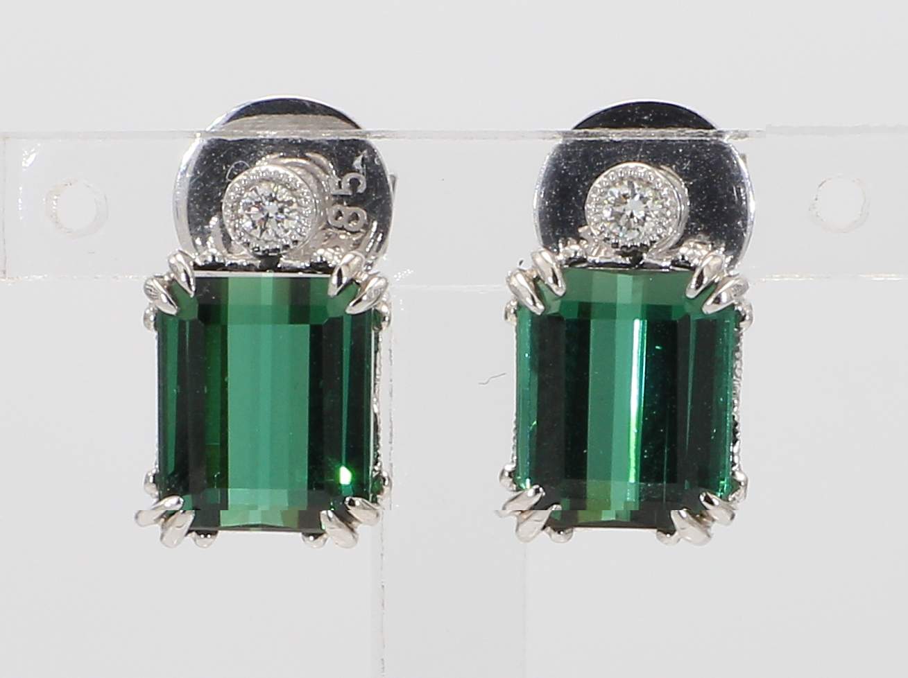 EMERALD CUT GREEN TOURMALINE & ROUND DIAMOND 14KW EARRING