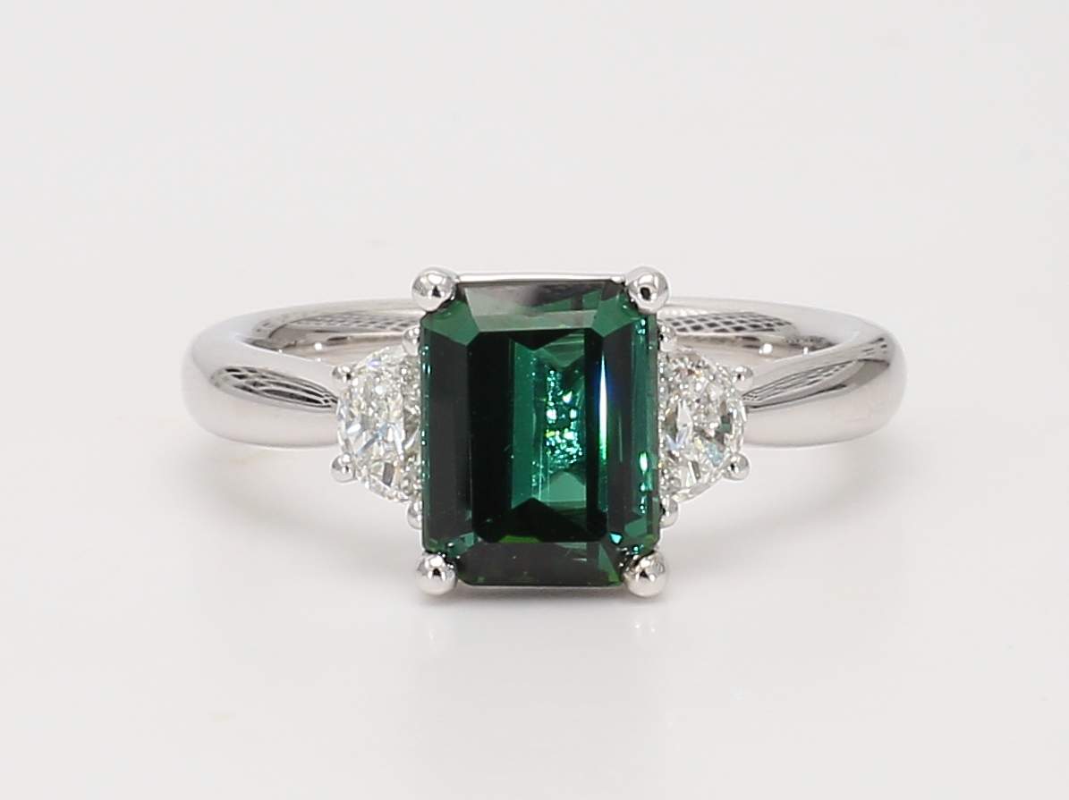 EMERALD CUT GREEN TOURMALINE & HALF MOON DIAMOND 14KW RING