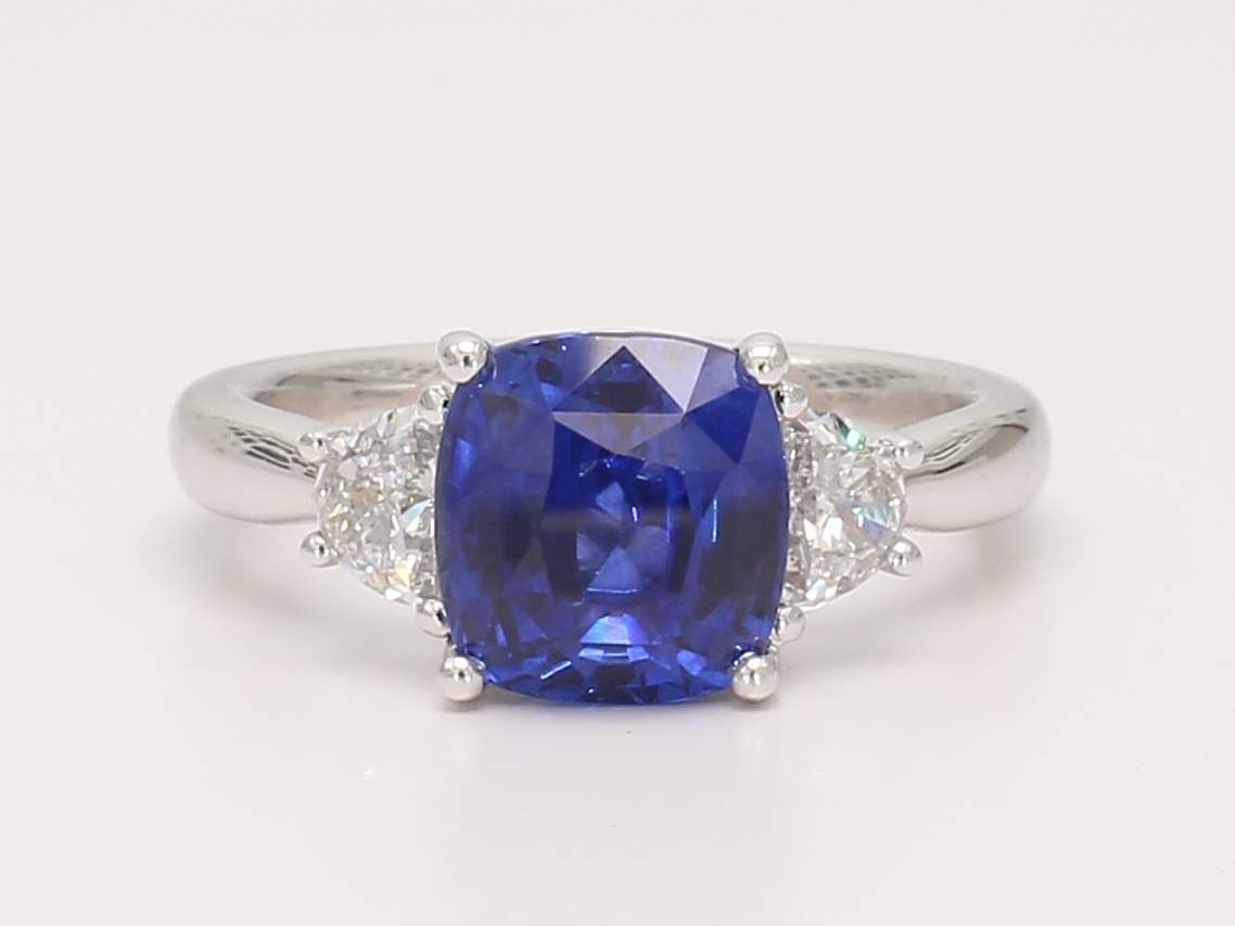 CUSHION SAPPHIRE VIVID BLUE CDC 2211911 & HALF MOON DIAMOND PLATINUM RING