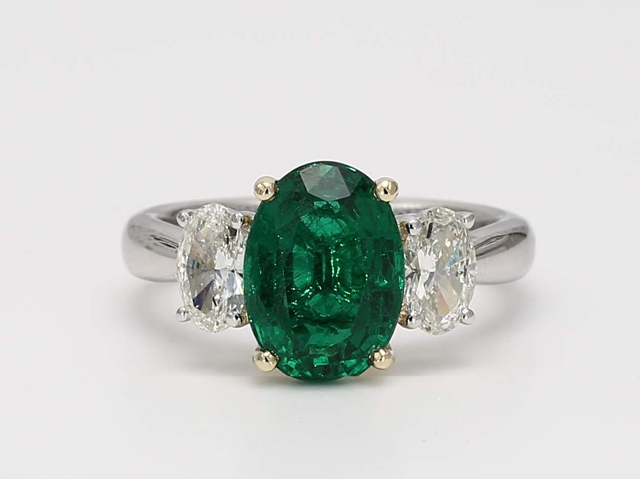 OVAL EMERALD VIVID GREEN MINOR CDC 2301901 & OVAL DIAMOND PLATINUM RING