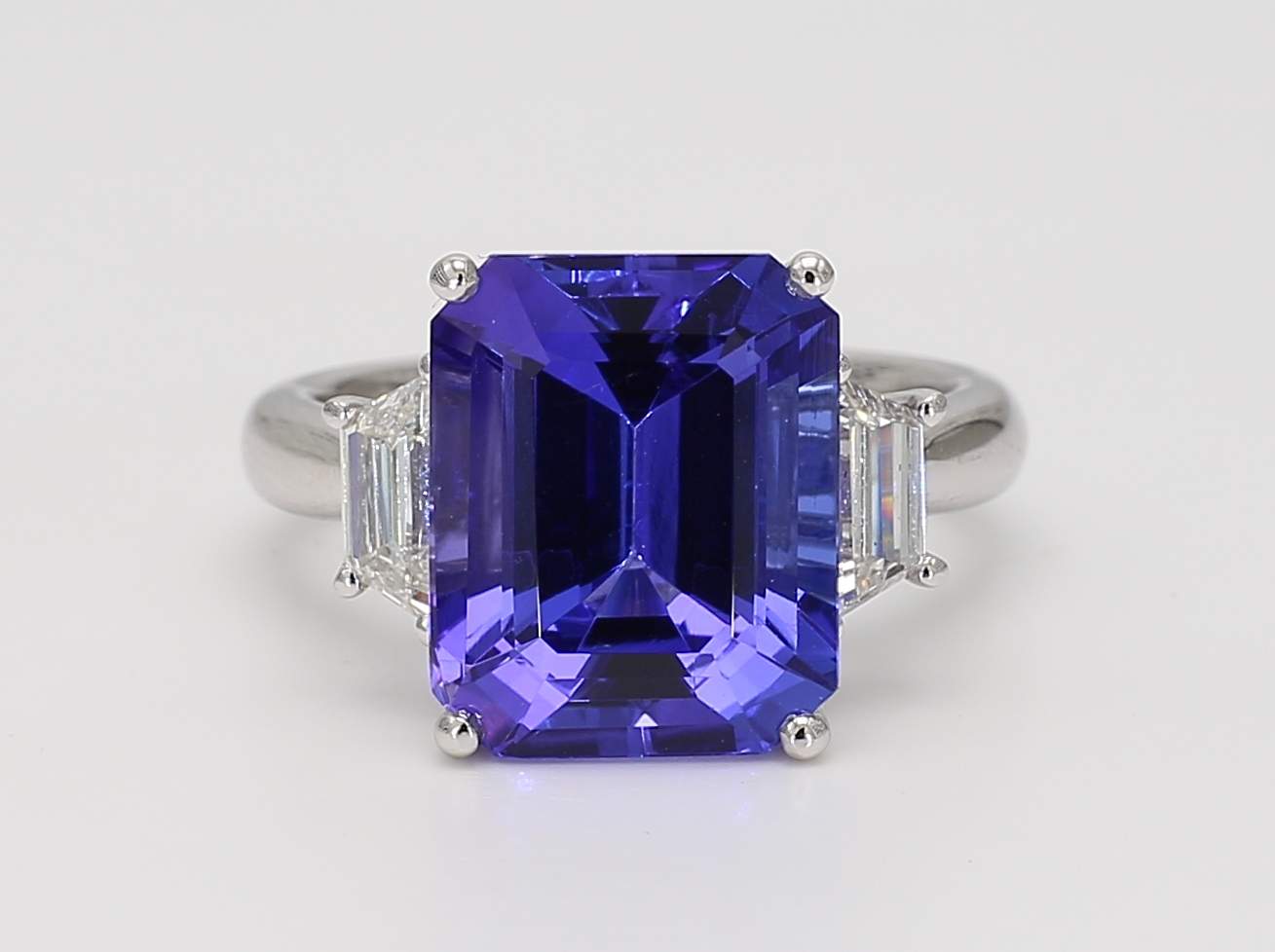 EMERALD CUT TANZANITE & TRAPEZOID DIAMOND PLATINUM RING