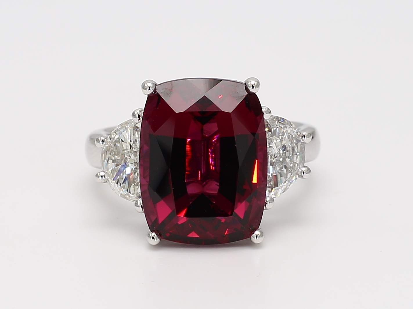 CUSHION RHODOLITE GARNET & HALF MOON CVD DIAMOND 14KW RING