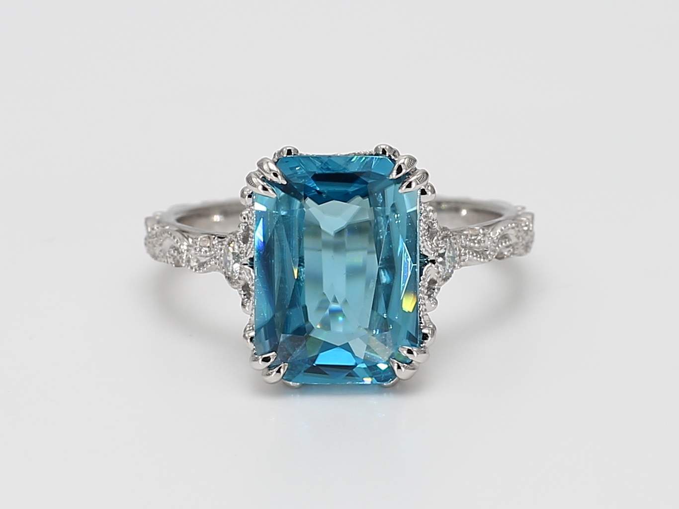 EMERALD CUT ZIRCON & ROUND DIAMOND 14KW RING