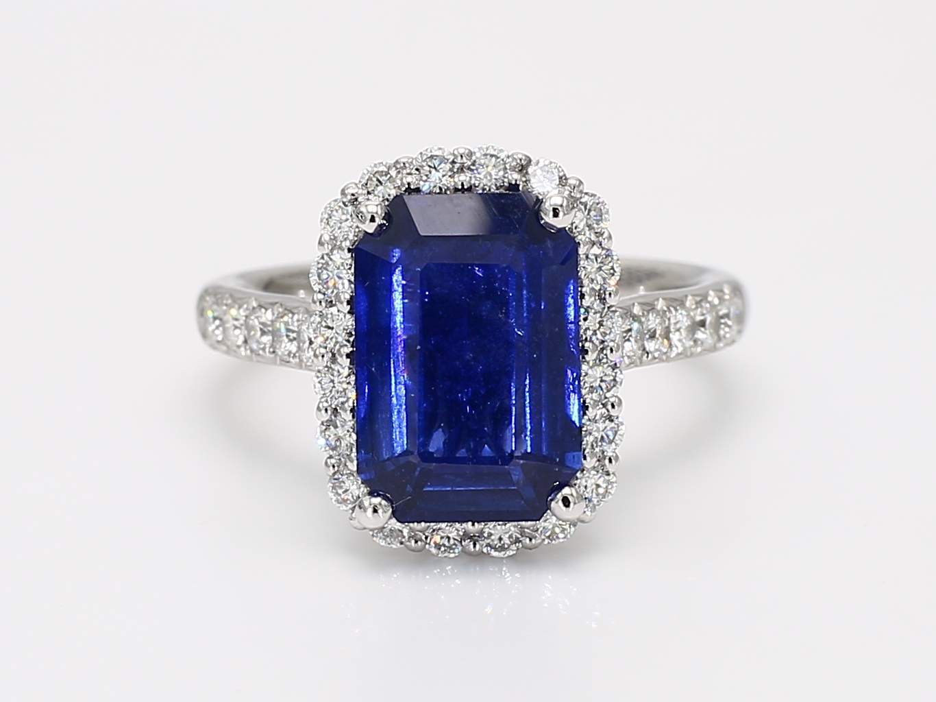 EMERALD CUT CEYLON SAPPHIRE CDC 2308479 ROUND DIAMOND PLATINUM RING