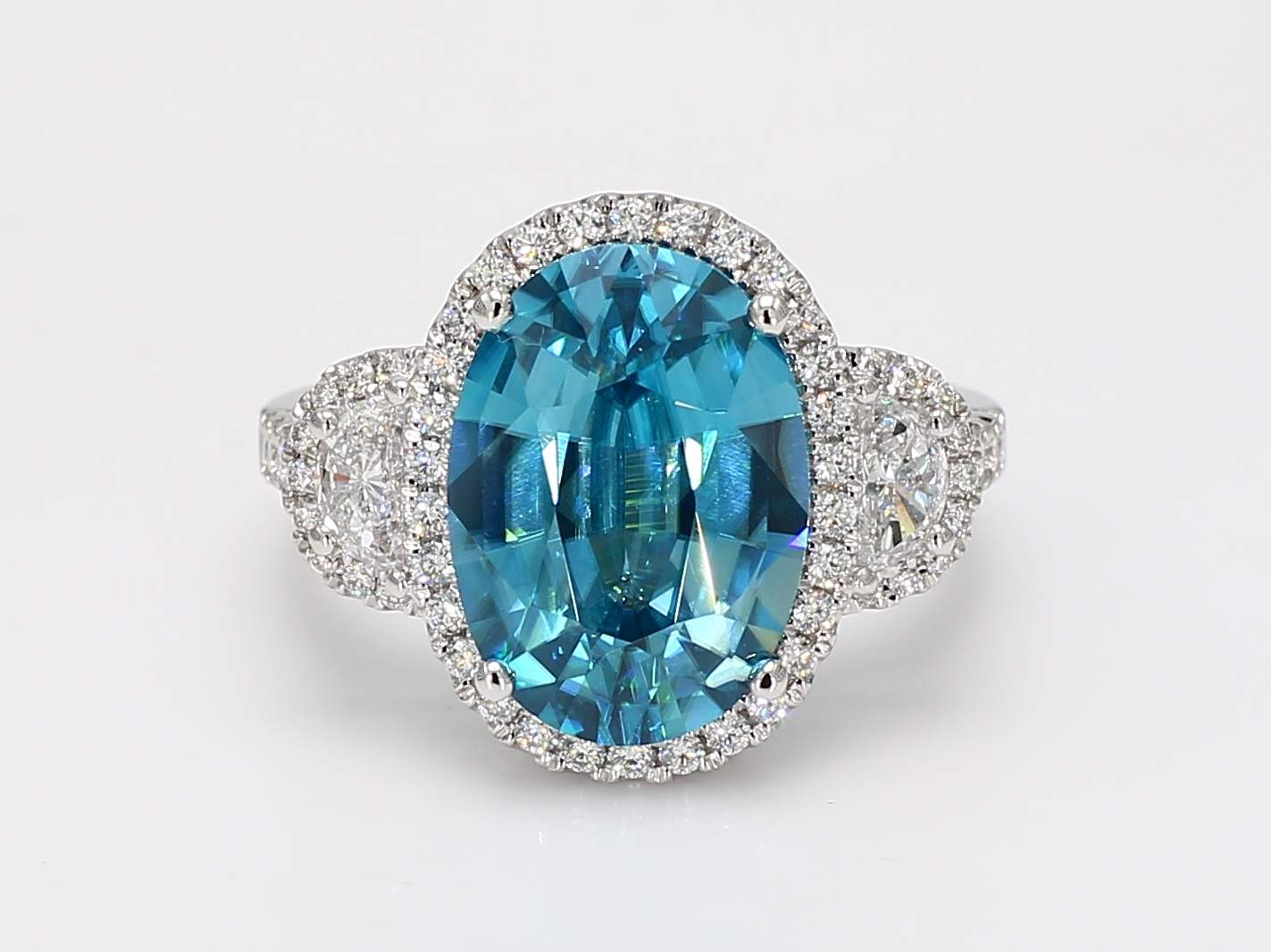 OVAL BLUE ZIRCON & HALF MOON & ROUND DIAMOND 14KW RING