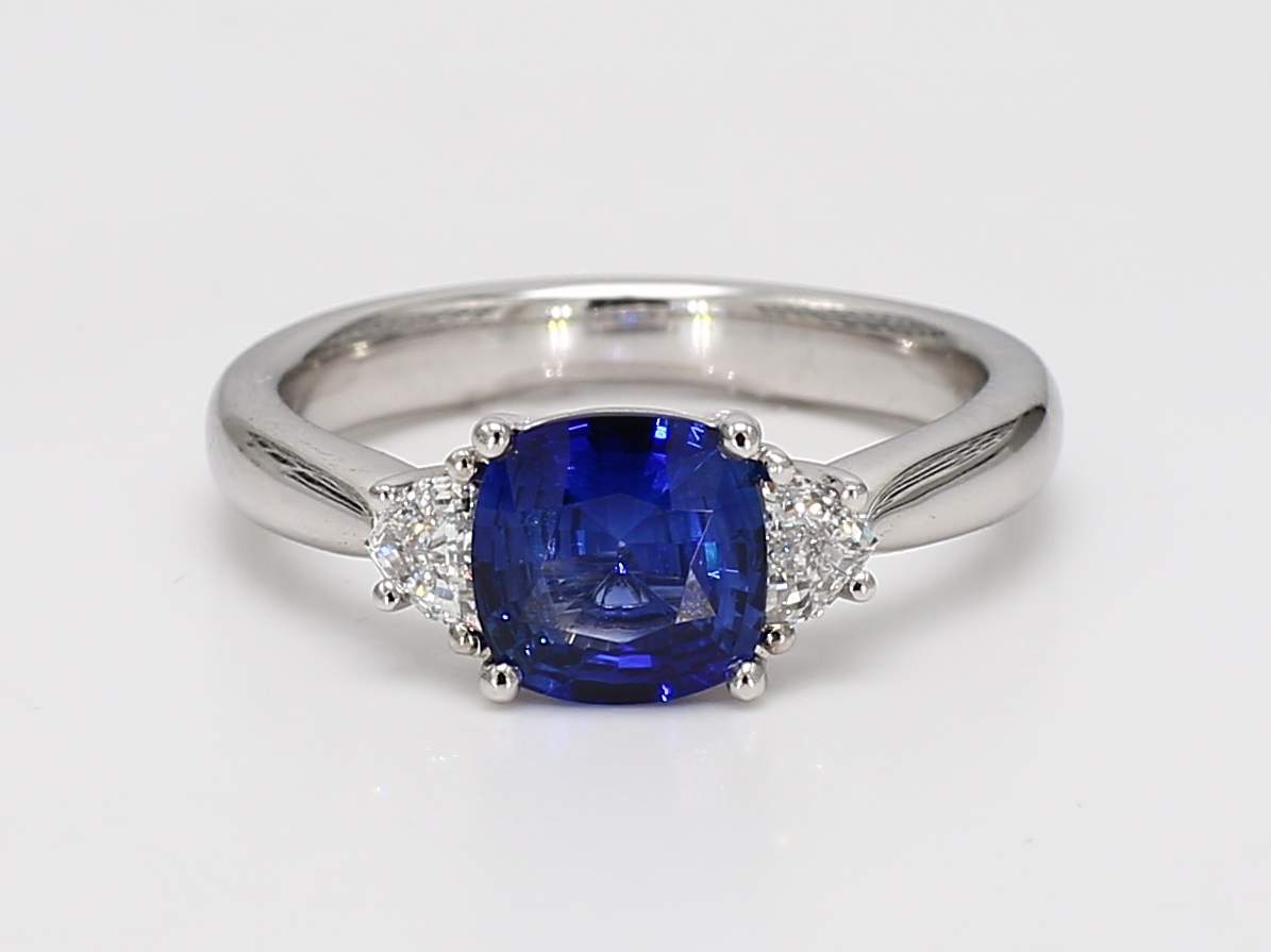 CUSHION SAPPHIRE & EPAULETTE DIAMOND & ROUND DIAMOND PLATINUM RING