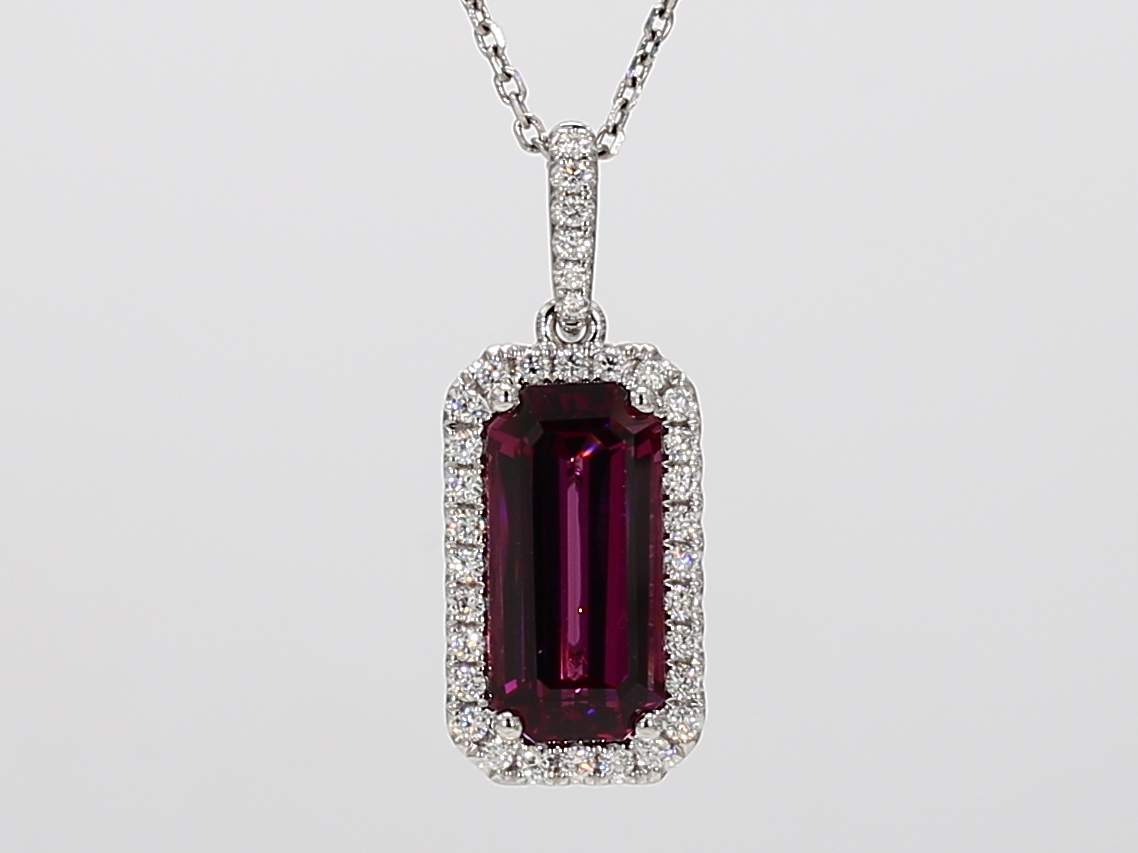 EMERALD CUT RHODOLITE GARNET & ROUND DIAMOND 14KW PENDANT