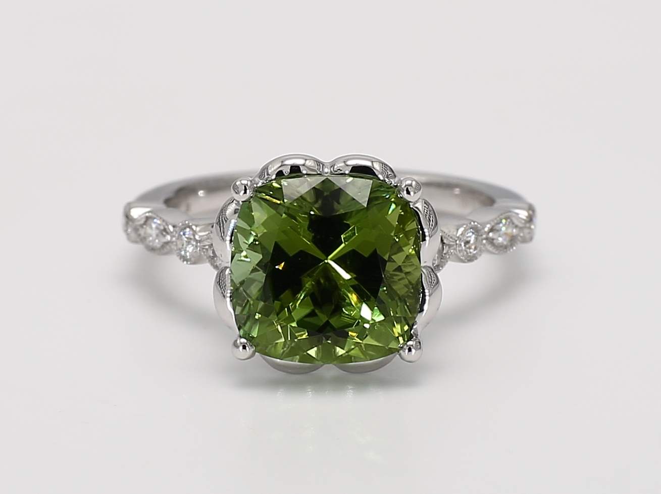 CUSHION GREEN TOURMALINE & ROUND DIAMOND 14KW RING