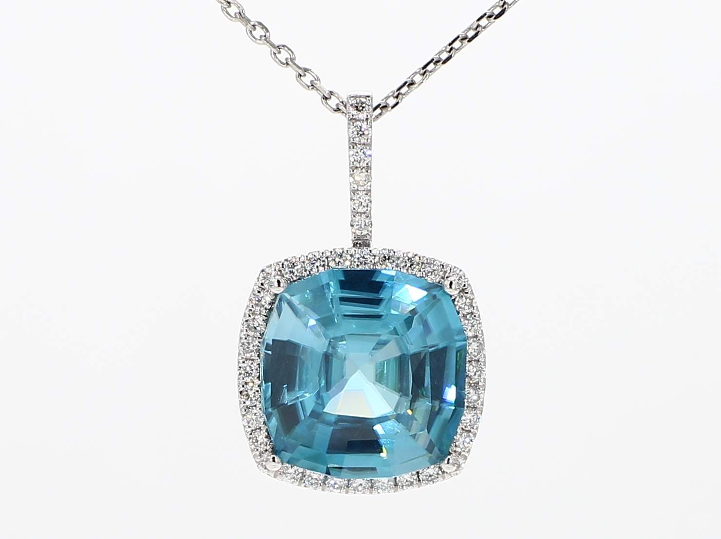 CUSHION BLUE ZIRCON & ROUND DIAMOND 14KW PENDANT