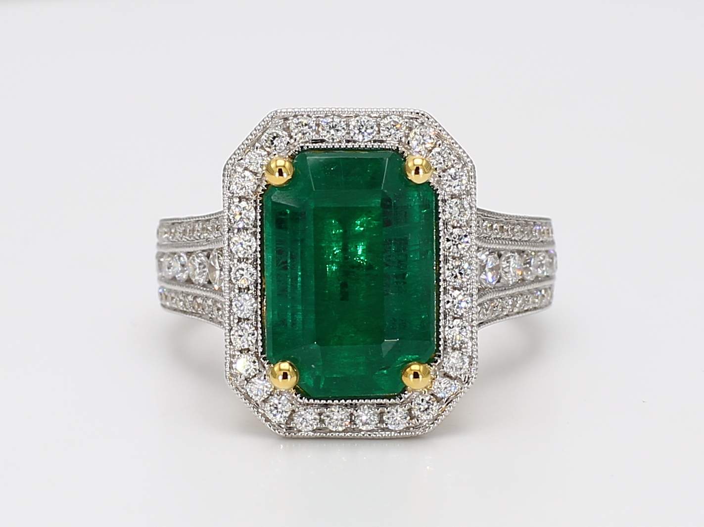 EMERALD CUT EMERALD VIVID GREEN CDC 23051036 & ROUND DIAMOND 18KW RING