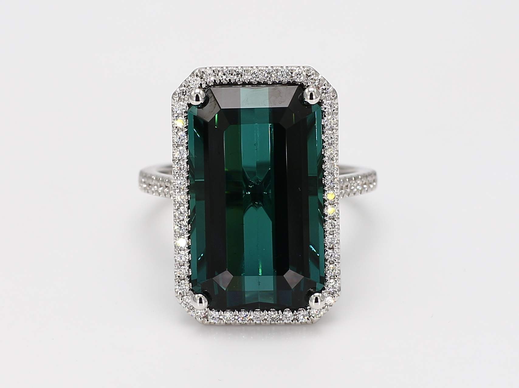 EMERALD CUT BLUE TOURMALINE & ROUND DIAMOND 14KW RING