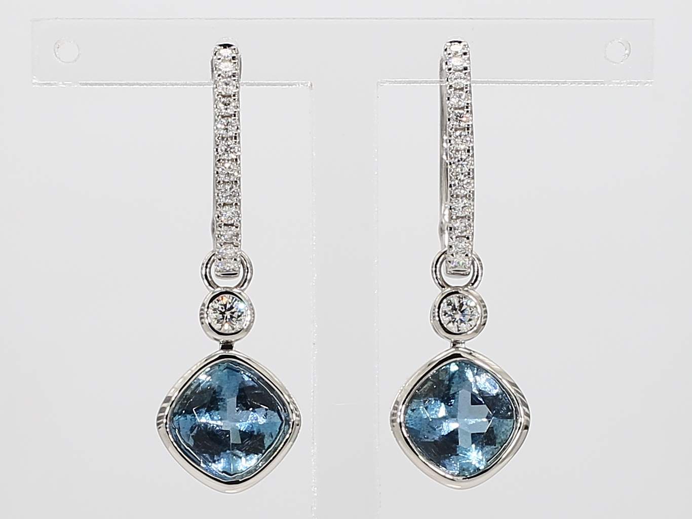 CUSHION AQUAMARINE & ROUND DIAMOND 14KW EARRING