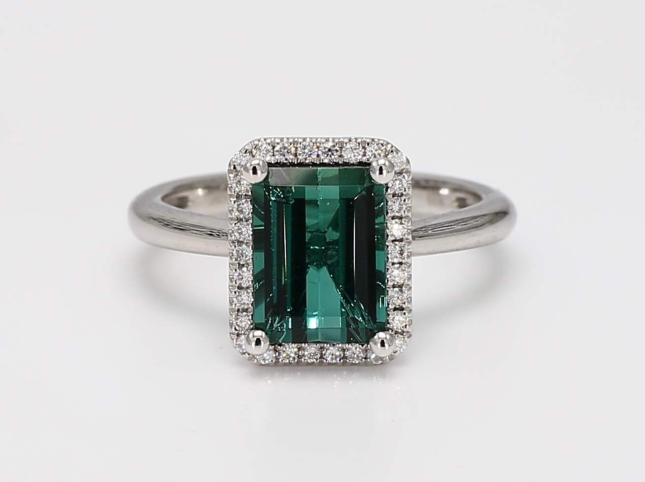 EMERALD CUT BLUE TOURMALINE & ROUND DIAMOND 14KW RING