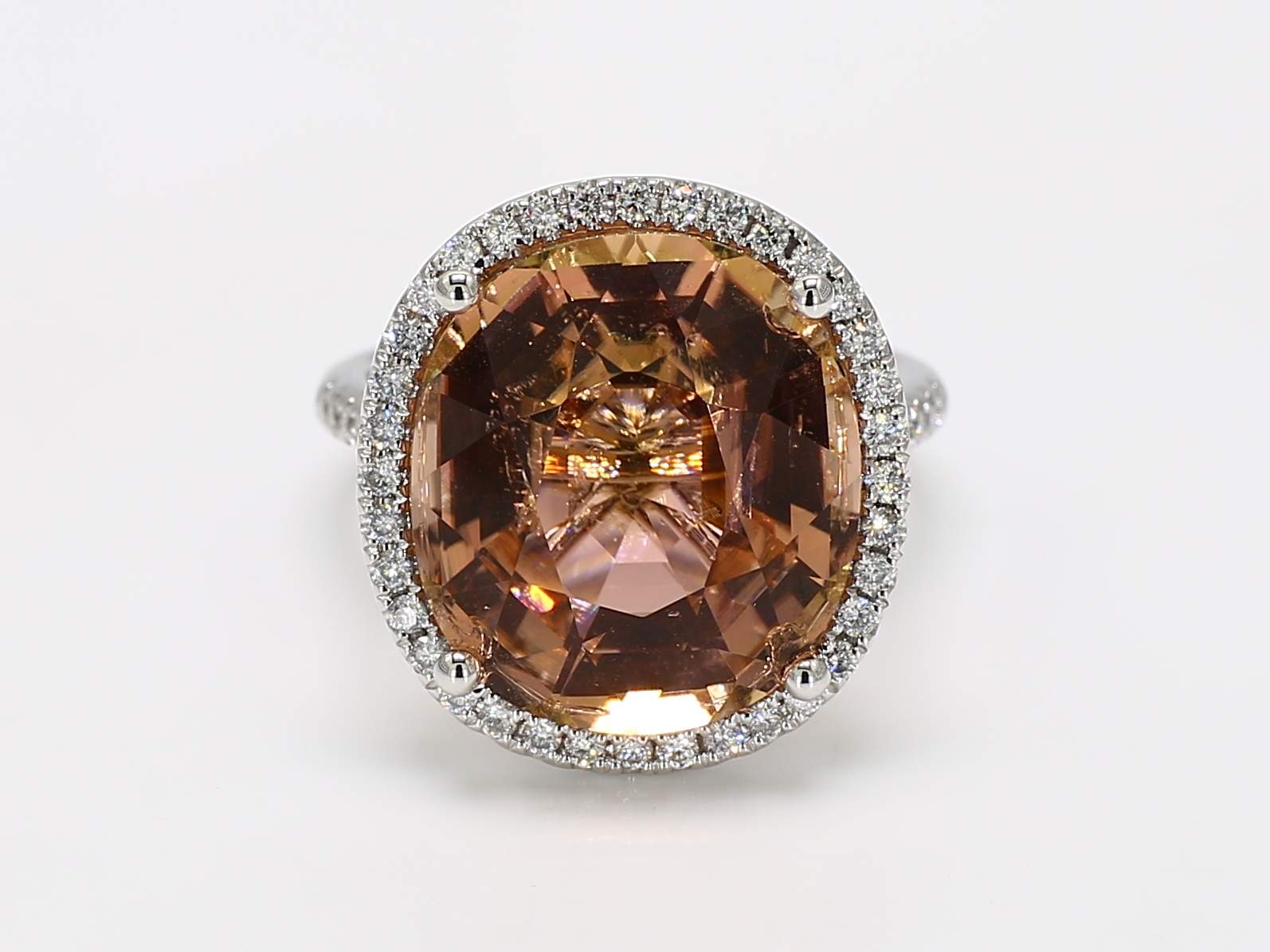 CUSHION PEACH TOURMALINE & ROUND DIAMOND 14KW RING