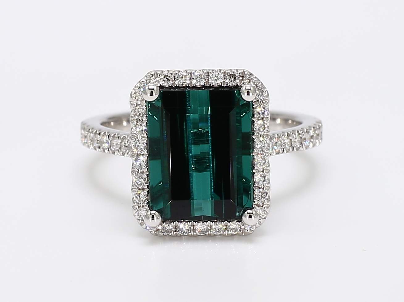 EMERALD CUT BLUE TOURMALINE & ROUND DIAMOND 14KW RING