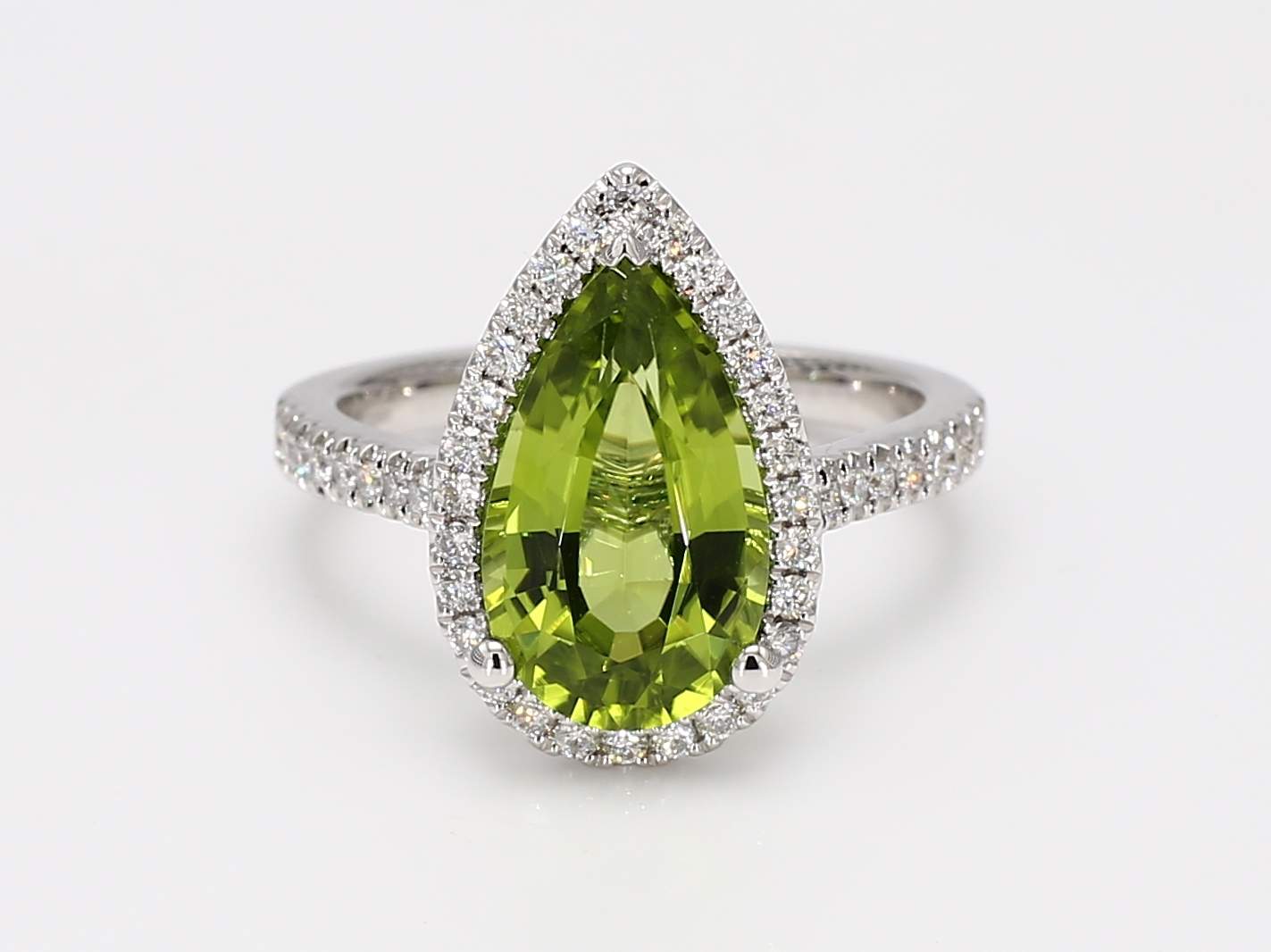PEAR SHAPE PERIDOT & ROUND DIAMOND 14KW RING