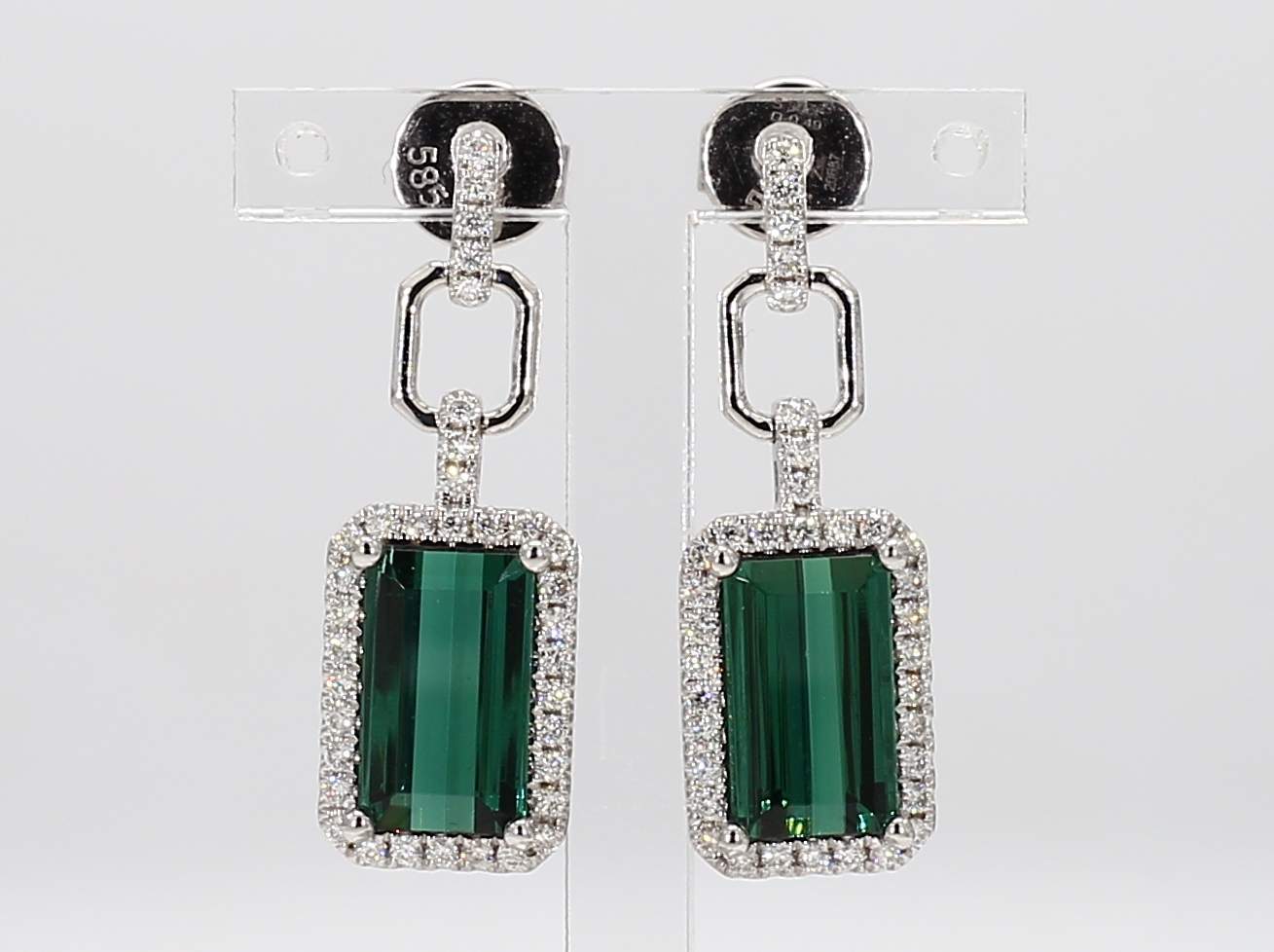 EMERALD CUT GREEN TOURMALINE & ROUND DIAMOND 14KW EARRING