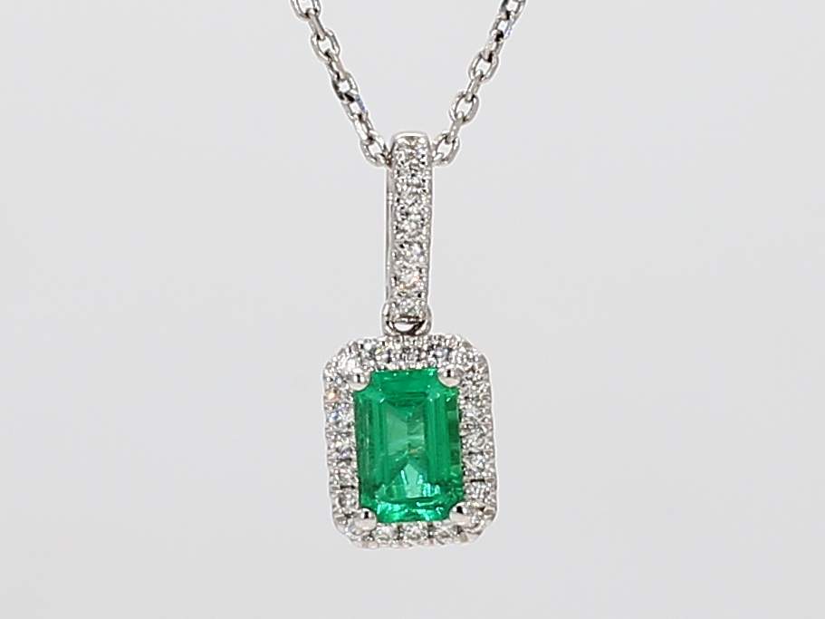 EMERALD CUT EMERALD & ROUND DIAMOND 14KW PENDANT