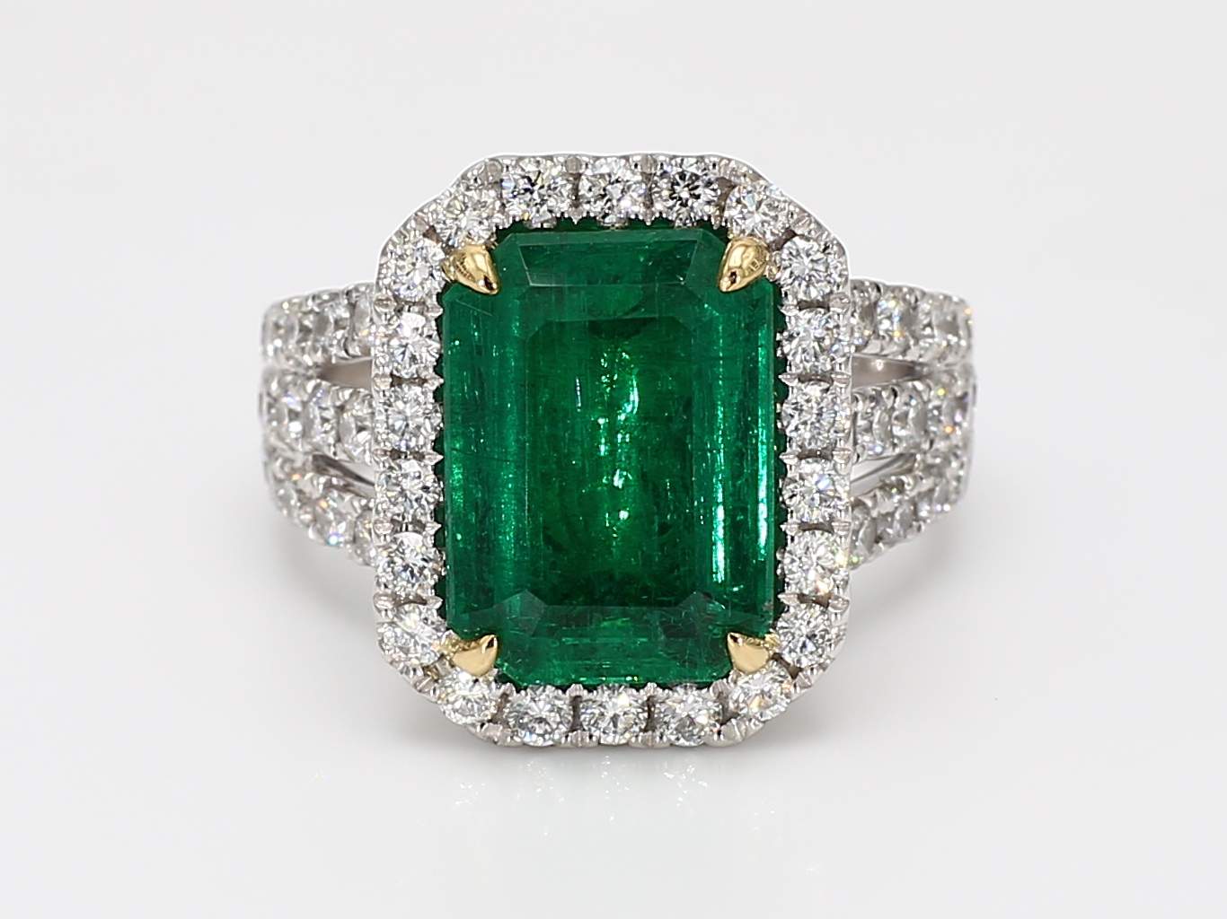 EMERALD CUT EMERALD VIVID GREEN MINOR CDC 2505461 & ROUND DIAMOND PLATINUM RING