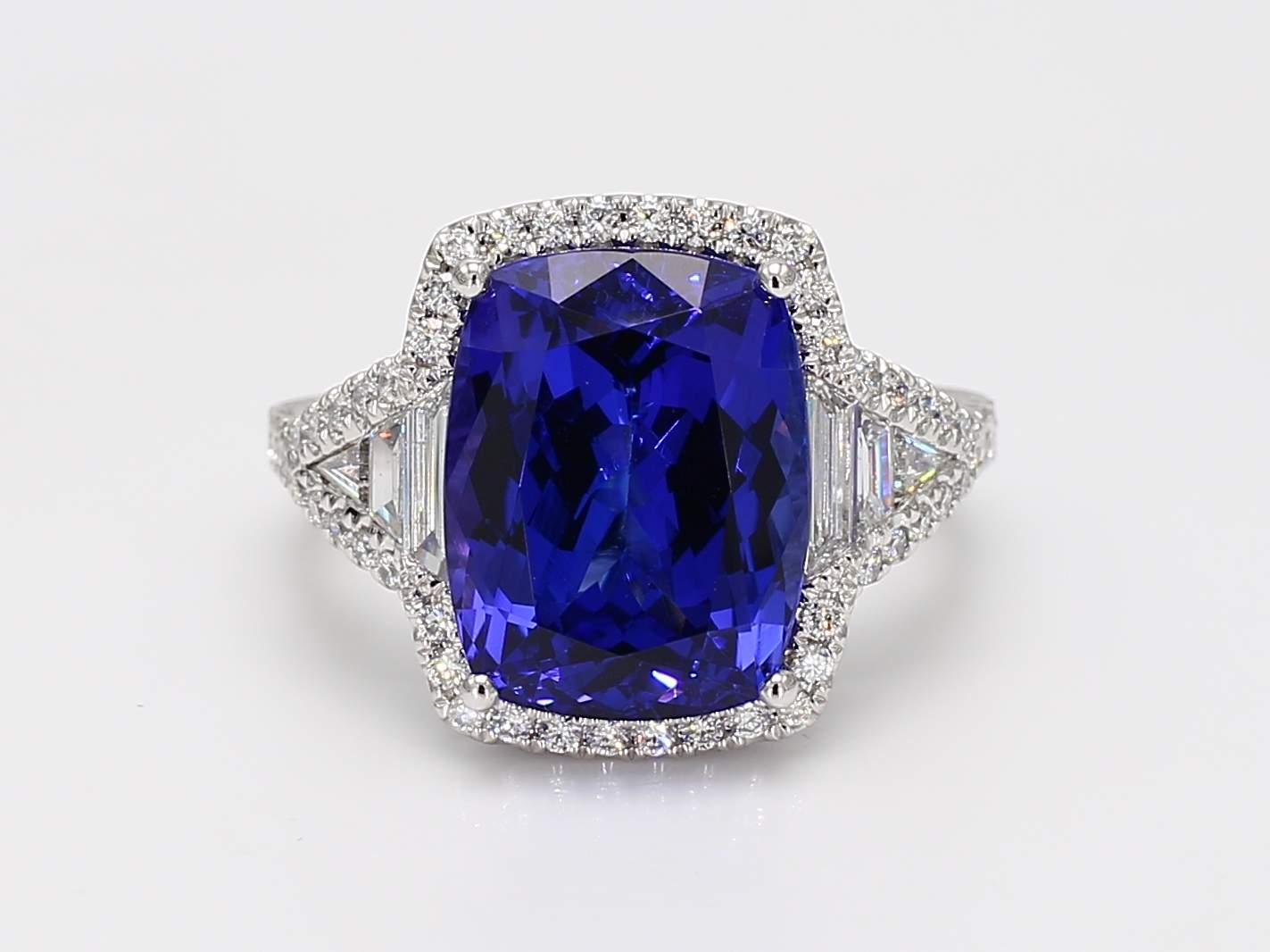 CUSHION TANZANITE & TRAPEZOID & ROUND DIAMOND PLATINUM RING