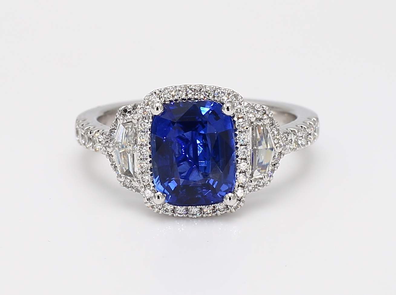 CUSHION CEYLON SAPPHIRE CDC 2405984 & EPAULETTE & ROUND DIAMOND PLATINUM RING