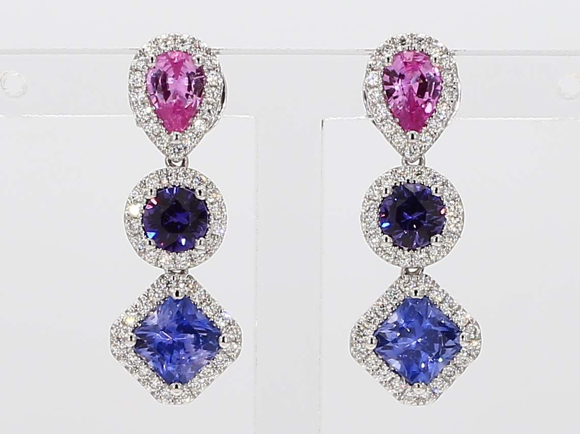 PEAR SHAPE PINK SAPPHIRE ROUND PURPLE SAPPHIRE RADIANT SAPPHIRE & ROUND DIAMOND 18KW EARRING