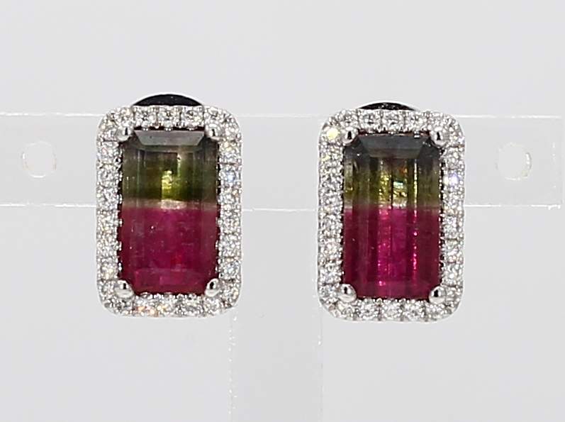 EMERALD CUT WATERMELON TOURMALINE & ROUND DIAMOND 14KW EARRING