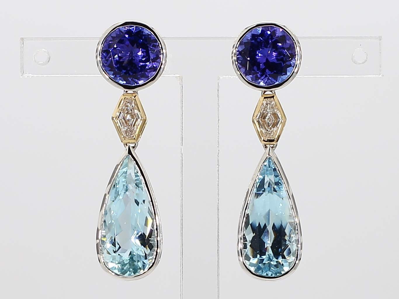 ROUND TANZANITE HEXAGON DIAMOND & PEAR SHAPE AQUAMARINE 14KT EARRING