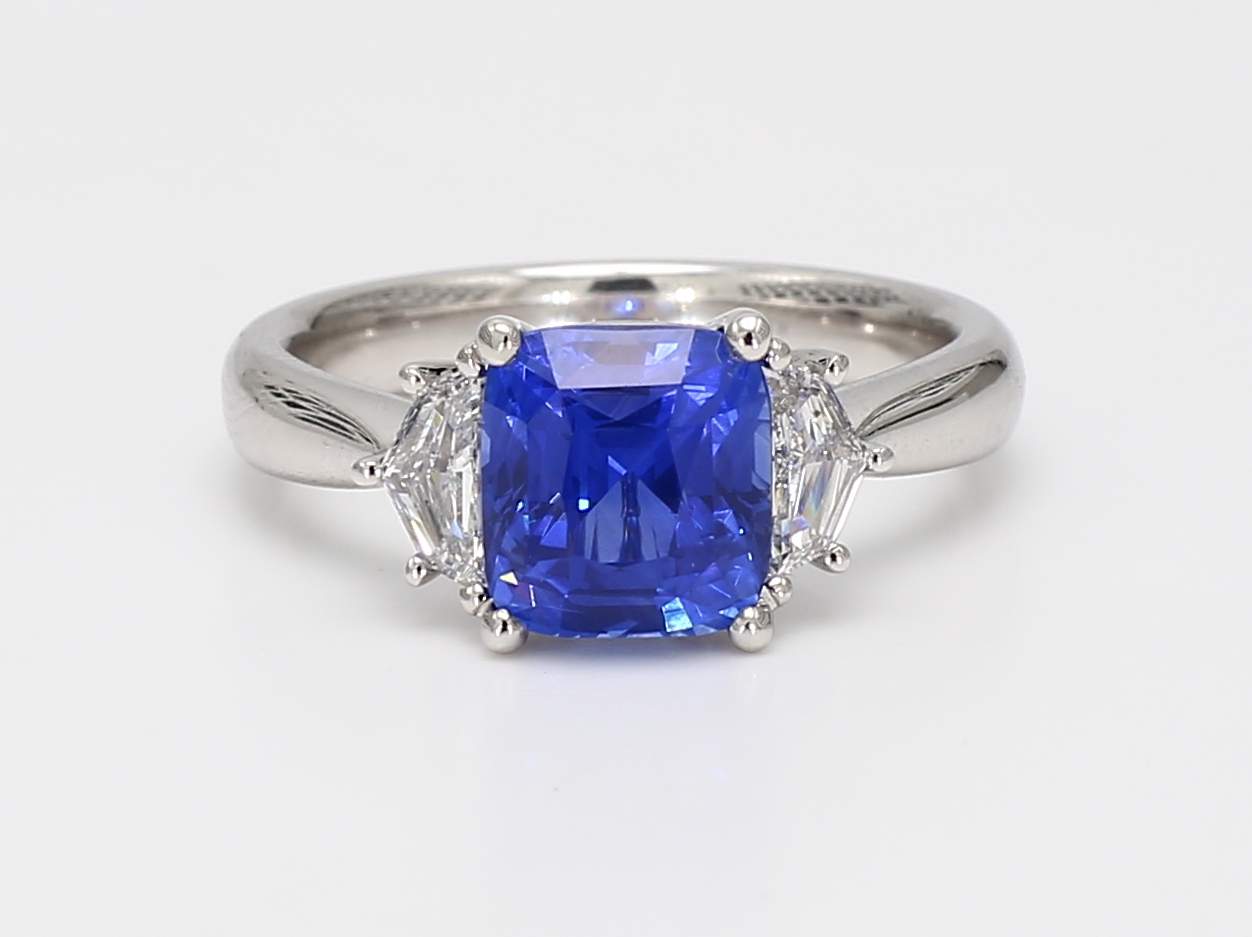 CUSHION SAPPHIRE CDC 2501233 & EPAULETTE DIAMOND PLATINUM RING