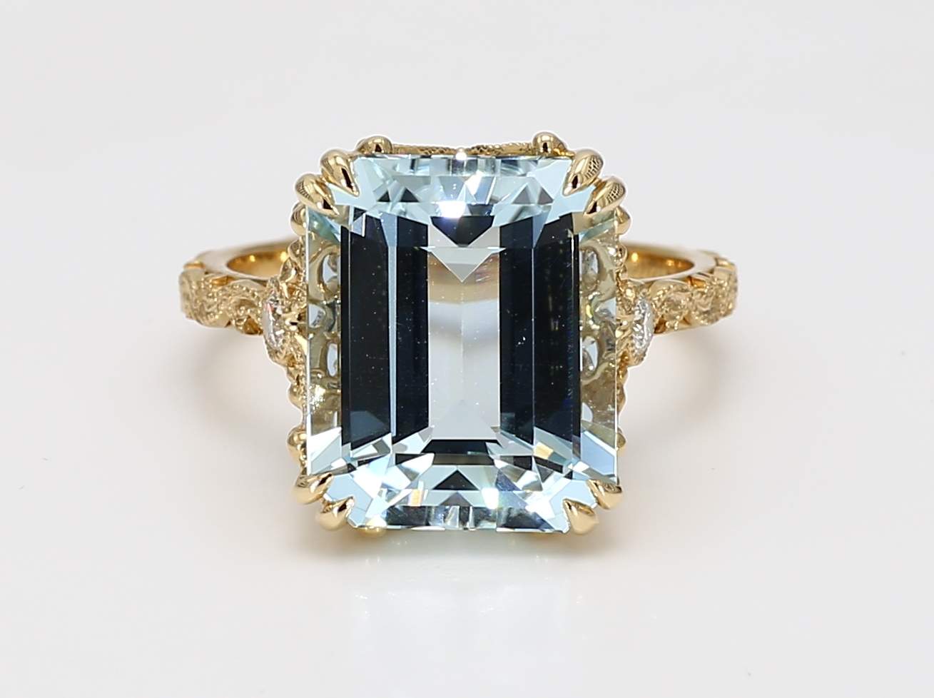 EMERALD CUT AQUAMARINE & ROUND DIAMOND 14KY RING