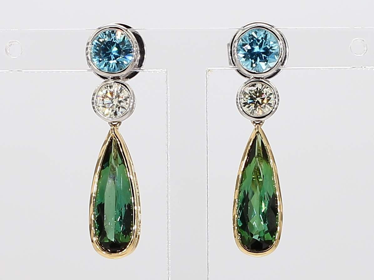 ROUND ZIRCON ROUND DIAMOND & PEAR SHAPE GREEN TOURMALINE 14KT EARRING