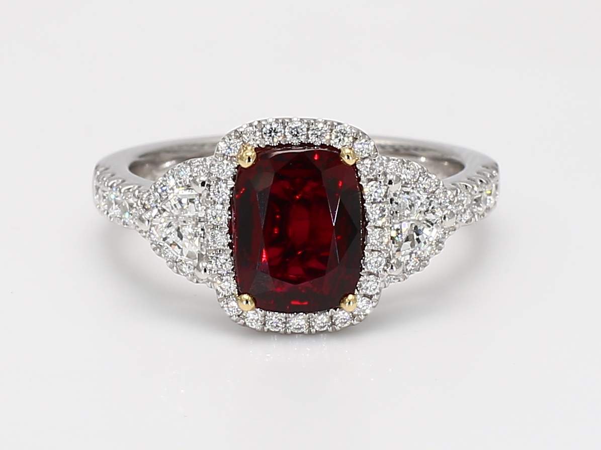 CUSHION RUBY VIVID RED CDC 2508574 & EPAULETTE DIAMOND & ROUND DIAMOND PLATINUM RING