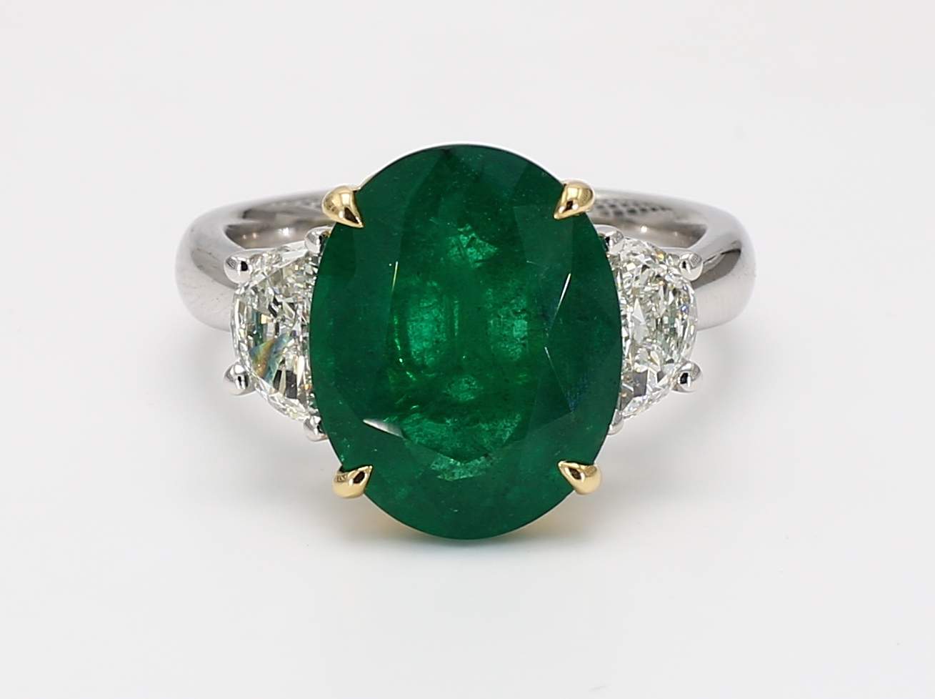 OVAL EMERALD INTENSE GREEN MINOR CDC 2508585 & HALF MOON DIAMOND PLATINUM & 18KY RING