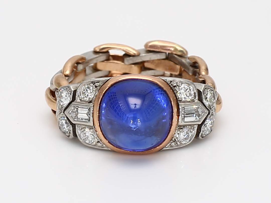 SUGAR LOAF KASHMIR SAPPHIRE SSEF 130707, AGL 1132125, GIA 2225873661 & ROUND & BULLET DIAMOND PLATINUM AND 18KR RING