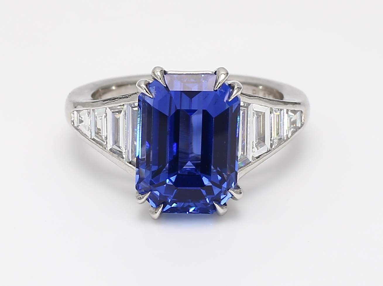 EMERALD CUT CEYLON SAPPHIRE GRS2025-017102 & TRAPEZOID DIAMOND PLATINUM RING